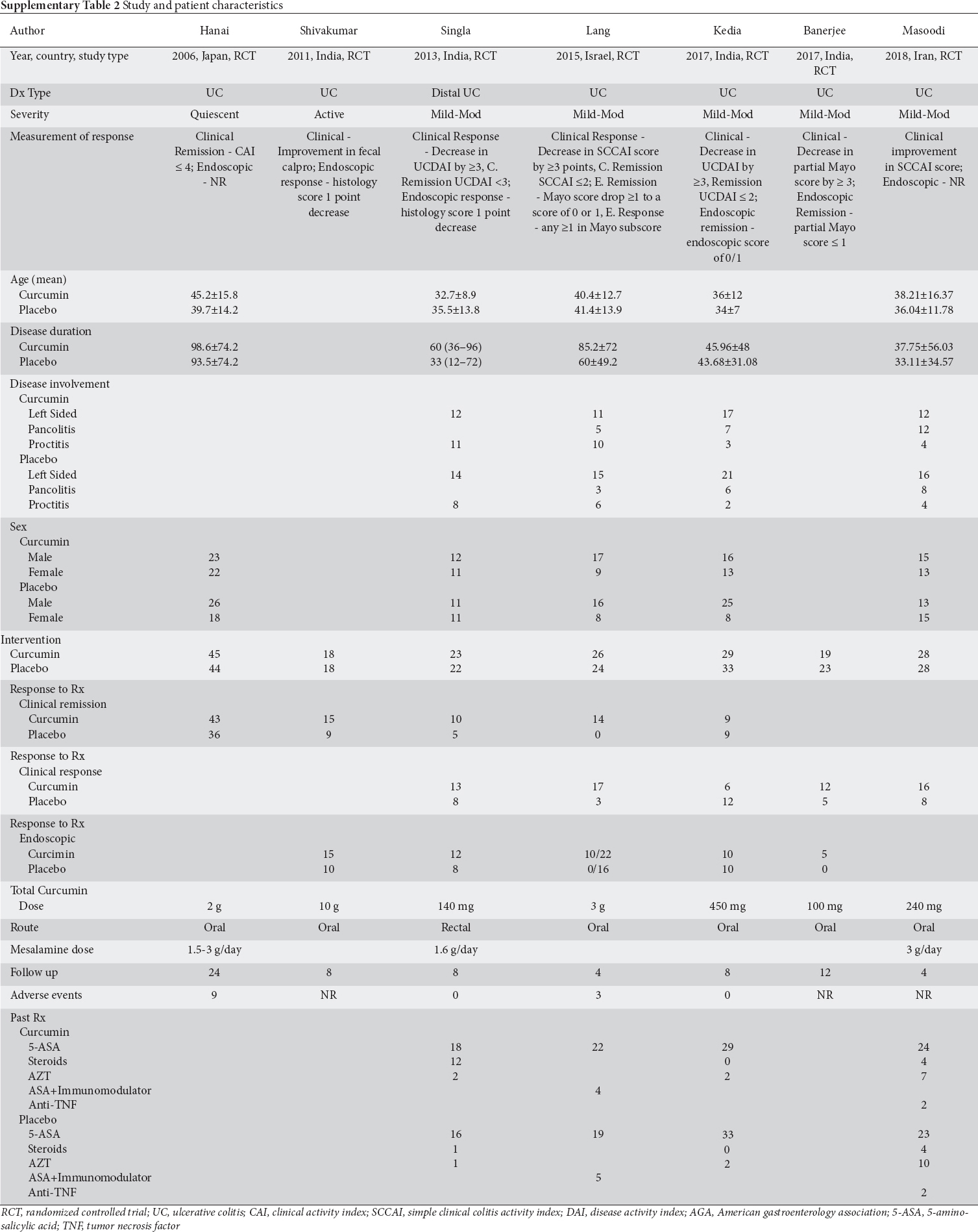 There were limitations to this study, most of which are inherent to any meta-analysis. The included studies were not entirely representative of the general population and community practice, with most being performed in tertiary-care referral centers. Heterogeneity was noted, most probably due to differences in the severity scoring indices used, the dosages of curcumin and the route of drug delivery. We wanted to analyze all the published literature on curcumin use in UC and included studies with active, quiescent as well as mild-to-moderate disease activity. We were not able to analyze our results based on the presence of comorbidities and were not able to assess the predictors of treatment success and/or failure. Nevertheless, our study is the best available estimate in the literature thus far with respect to the use of curcumin as an adjunct to mesalamine in the treatment of UC.